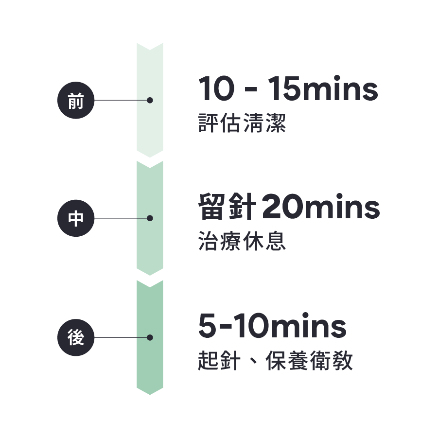 ● 副作用: 針灸過程可能產生局部痠脹感;術後少數情況可能出現微小瘀青或紅腫,通常於 3-7 天內自行消退。