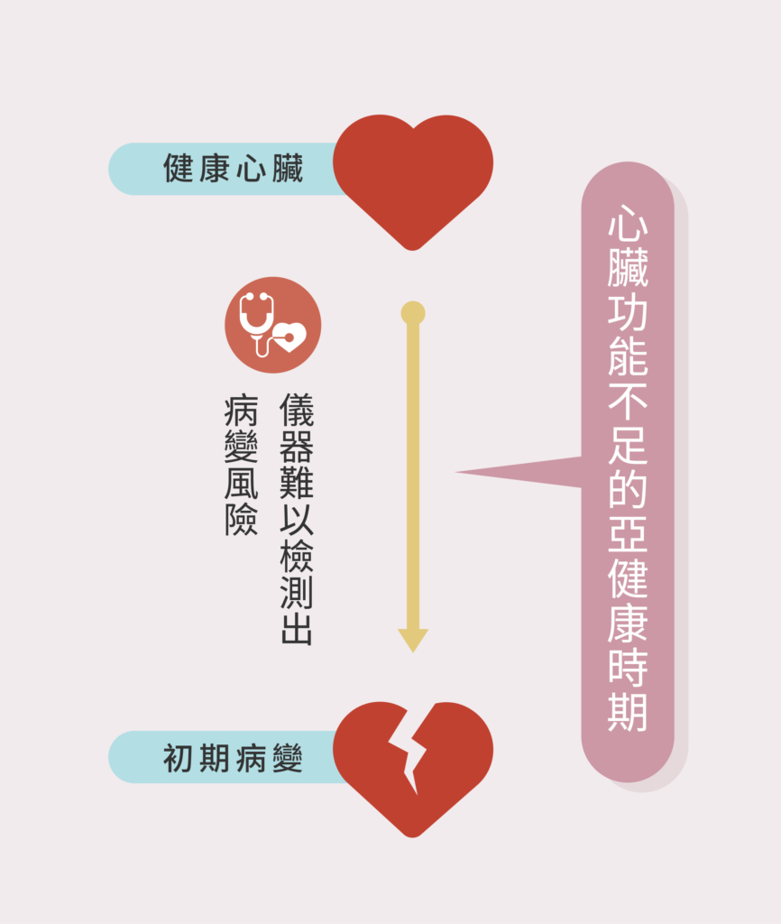 其實從健康的心臟演變到所謂的冠狀動脈硬化、腦中風這類的心臟血管疾病之間,會有一段心臟功能不足的亞健康時期。然而在這段亞健康時期,大部分人可能會因為只是「偶發」性的不舒服,而忽視身體的警訊;或是,覺得胸悶不舒服,但到了醫院卻難以檢查出具體的病灶。