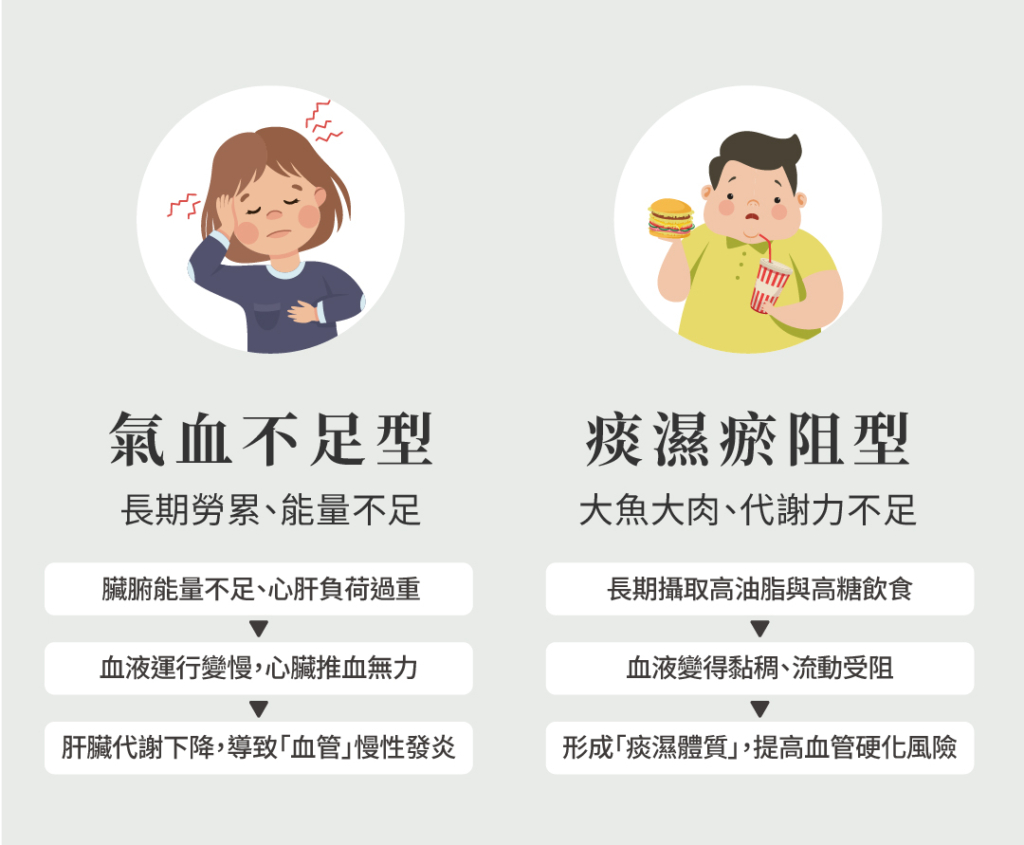 而另一種則是喜歡大魚大肉、愛吃甜食的人,吃進太多不好的油脂以及食品添加物,遠遠超過身體代謝的負荷,積在體內造成腸胃免疫系統紊亂、血液黏稠度增加,而使血液的流動困難度增加,便容易沉積在血管壁形成瘀血,形成中醫所說的「痰濕」體質。 這些沉積在血管壁的瘀血,更是會提升動脈硬化、血管栓塞的風險,因此在治療上,除了活血化瘀以外,還需要提升腸胃的消化功能、幫助飲食垃圾的代謝排出,以及清除血管的黏稠物質。