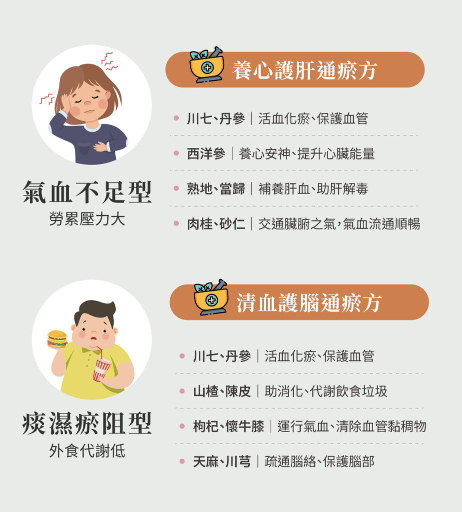 廖啟卉醫師也針對這常見的兩大類型,調配出心血管疾患的專屬調理方: