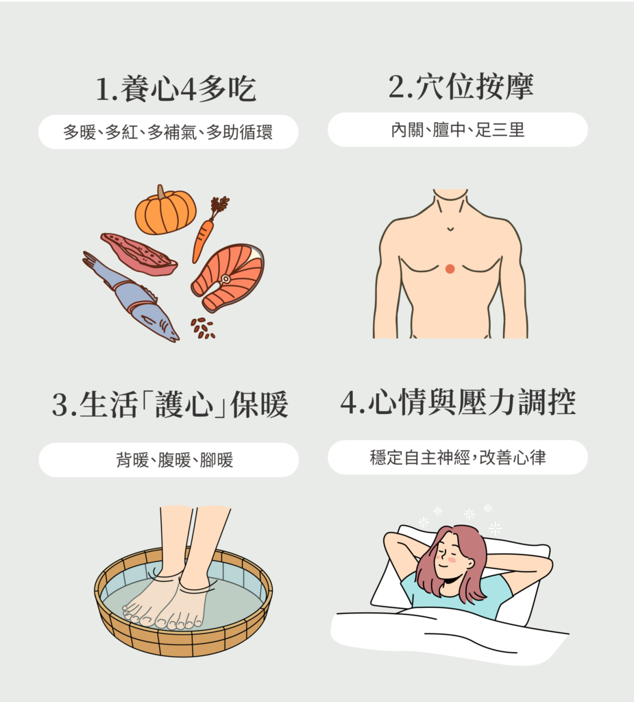 如果曾經有心臟不適的相關症狀產生,在秋冬、天氣變化時,平時一定要多留意身體的變化。日常生活中會出現反覆心悸、胸悶、呼吸不順、容易疲倦或頭暈等症狀,建議儘早諮詢中醫師。 心臟健康不是突發性的結果,而是日常疲勞的累積。當身體不斷有反覆的不適感,其實就是身體給出的警訊,及早就醫檢查,不僅能預防惡化,更能讓中醫幫助調理整體體質。