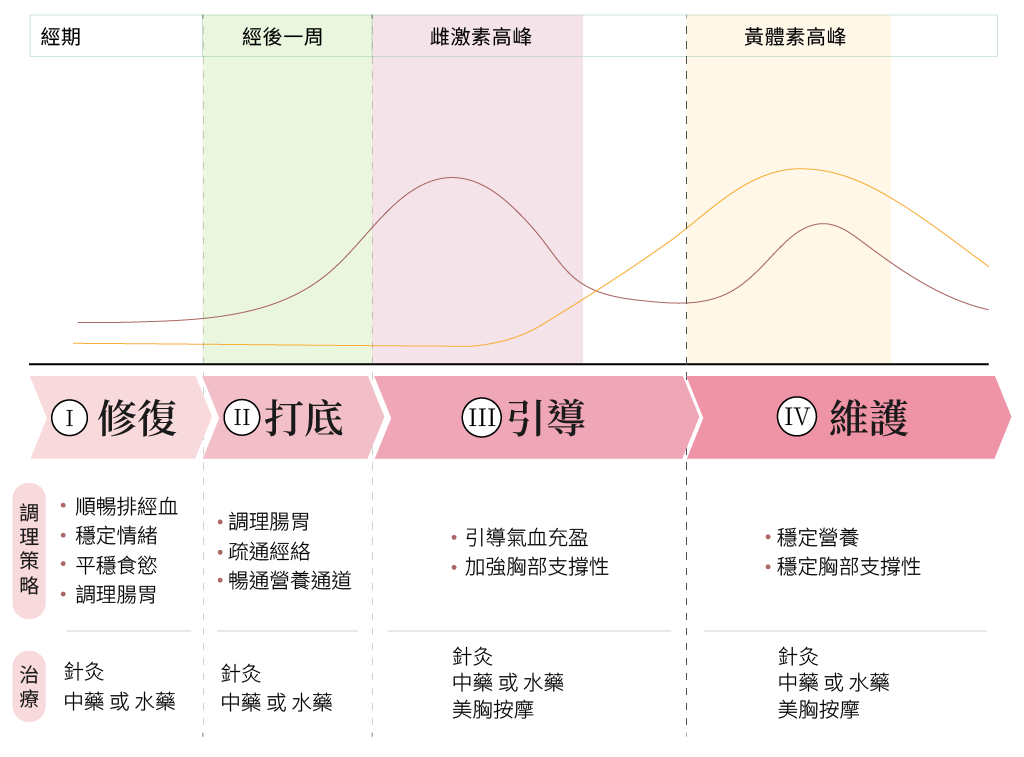 【調理重點】初期先強化脾胃吸收與氣血生成,建立穩定基礎;後續配合針灸疏通上胸區域經絡,並於月經週期適當時機加強引導氣血向上集中。
